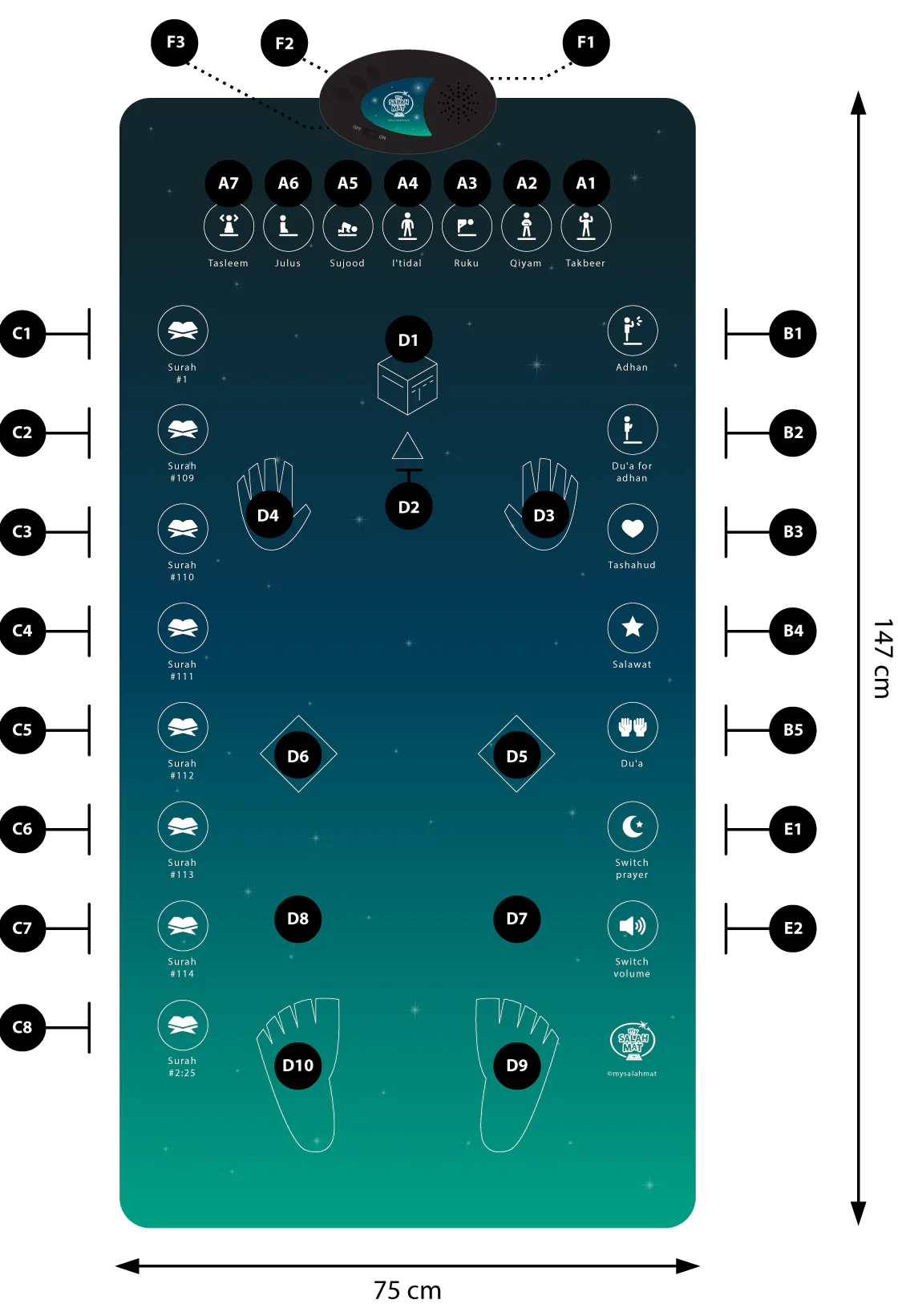 🎵 26 Touch-Sensitive Keys: This mat includes 26 touch-sensitive keys that guide you through pre-recorded Surahs and Dua, ensuring a comprehensive understanding of each prayer.